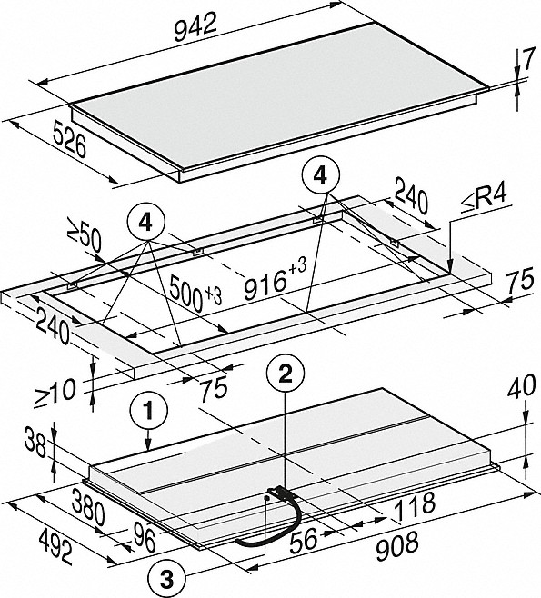 Характер огранки фаски на внешней стороне варочной панели. Металлические рамки предотвращают забивание монтажных швов крошками и пылью.
