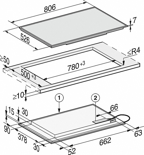 Характер огранки фаски на внешней стороне варочной панели. Металлические рамки предотвращают забивание монтажных швов крошками и пылью.