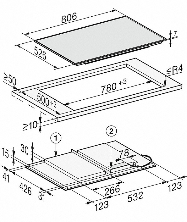 Характер огранки фаски на внешней стороне варочной панели. Металлические рамки предотвращают забивание монтажных швов крошками и пылью.