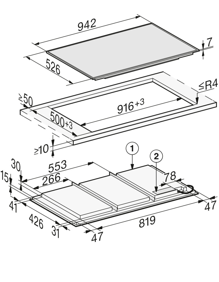 Характер огранки фаски на внешней стороне варочной панели. Металлические рамки предотвращают забивание монтажных швов крошками и пылью.