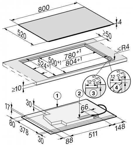 Характер огранки фаски на внешней стороне варочной панели. Металлические рамки предотвращают забивание монтажных швов крошками и пылью.