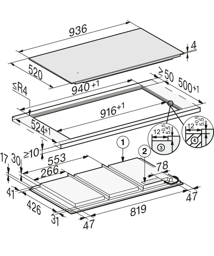 Характер огранки фаски на внешней стороне варочной панели. Металлические рамки предотвращают забивание монтажных швов крошками и пылью.