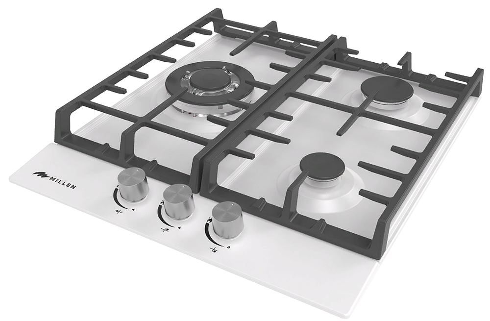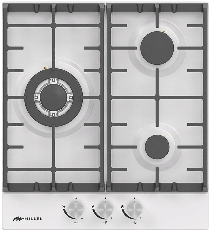 поверхность газовая, 45 см, газ на эмали, 3 конфорки, решетки чугунные, белый