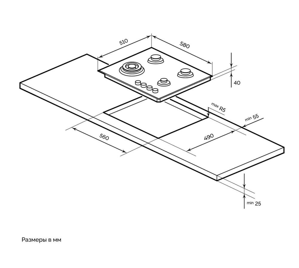 Расположение панели управления варочной поверхностью относительно конфорок. Если панель расположена сбоку, она будет справа.