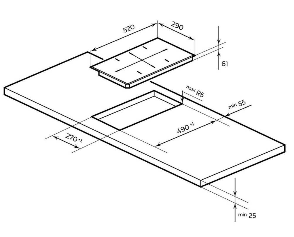 Характер огранки фаски на внешней стороне варочной панели. Металлические рамки предотвращают забивание монтажных швов крошками и пылью.