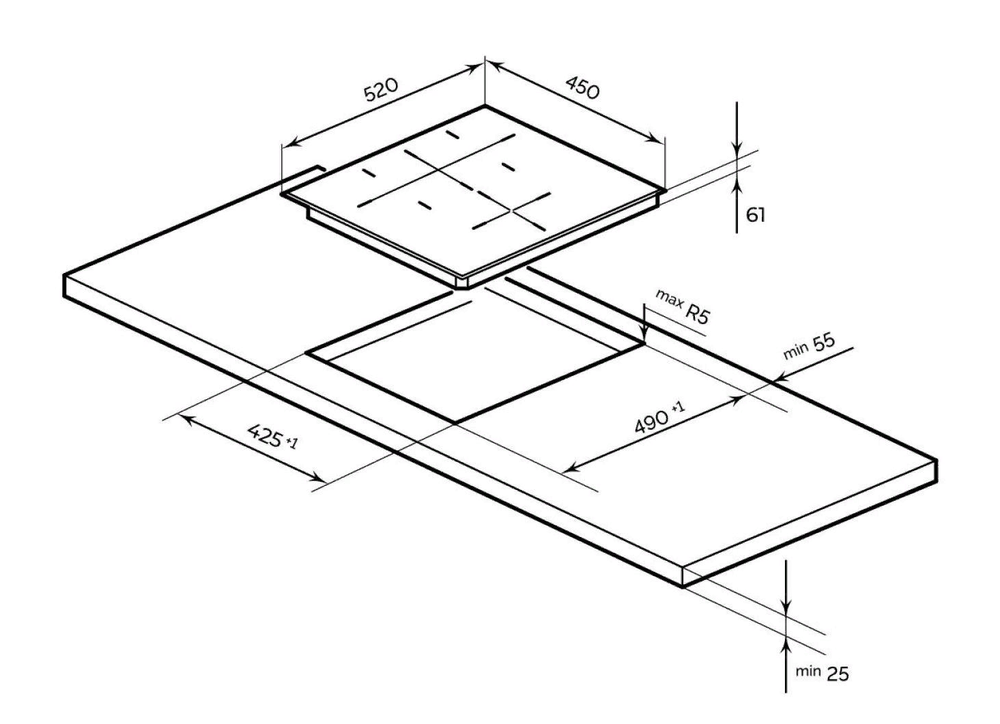 Характер огранки фаски на внешней стороне варочной панели. Металлические рамки предотвращают забивание монтажных швов крошками и пылью.