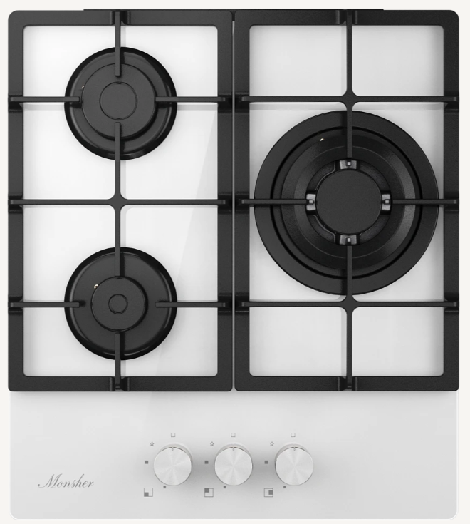 поверхность газовая, 45 см, газ на стекле, 3 конфорки, решетки чугунные, белый