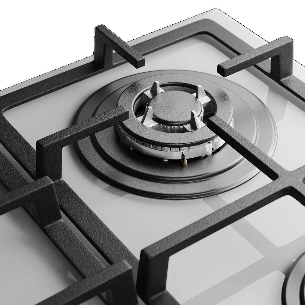 поверхность газовая, 60 см, газ на стекле, 4 конфорки, решетки чугунные, белый
