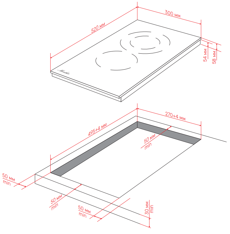 Характер огранки фаски на внешней стороне варочной панели. Металлические рамки предотвращают забивание монтажных швов крошками и пылью.