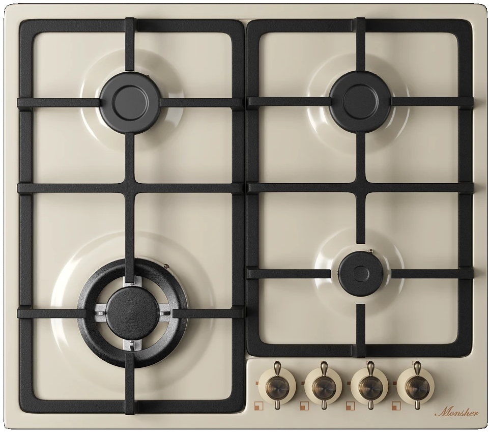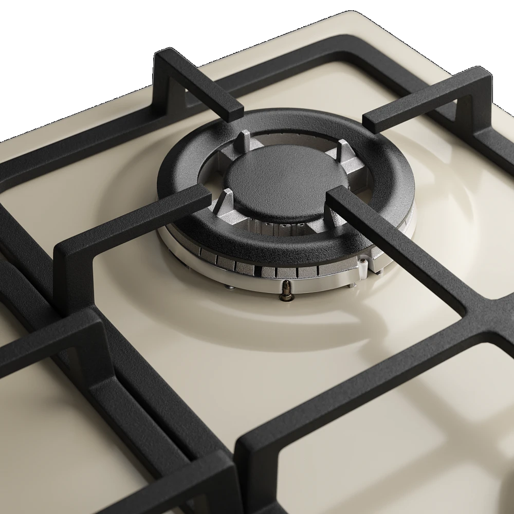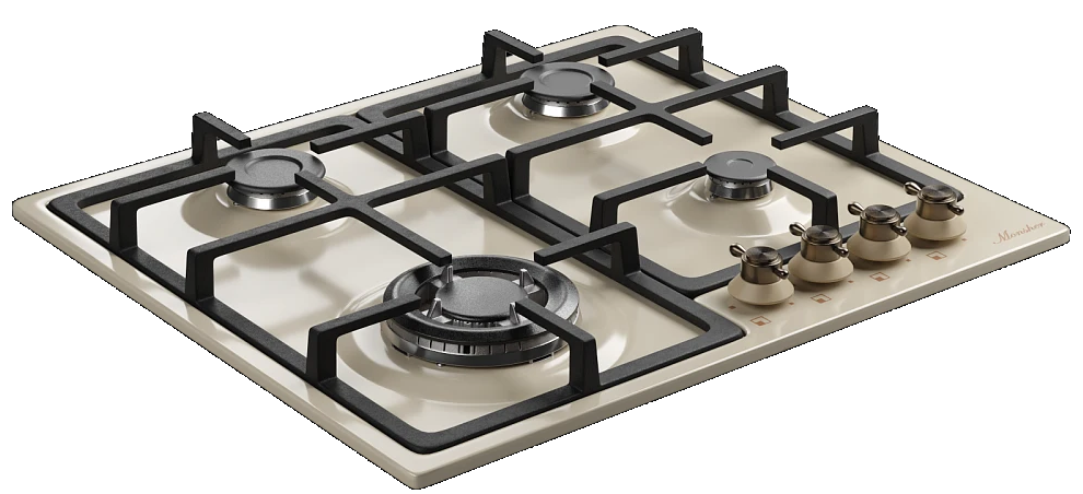 поверхность газовая, 60 см, газ на эмали, 4 конфорки, решетки чугунные, бежевый