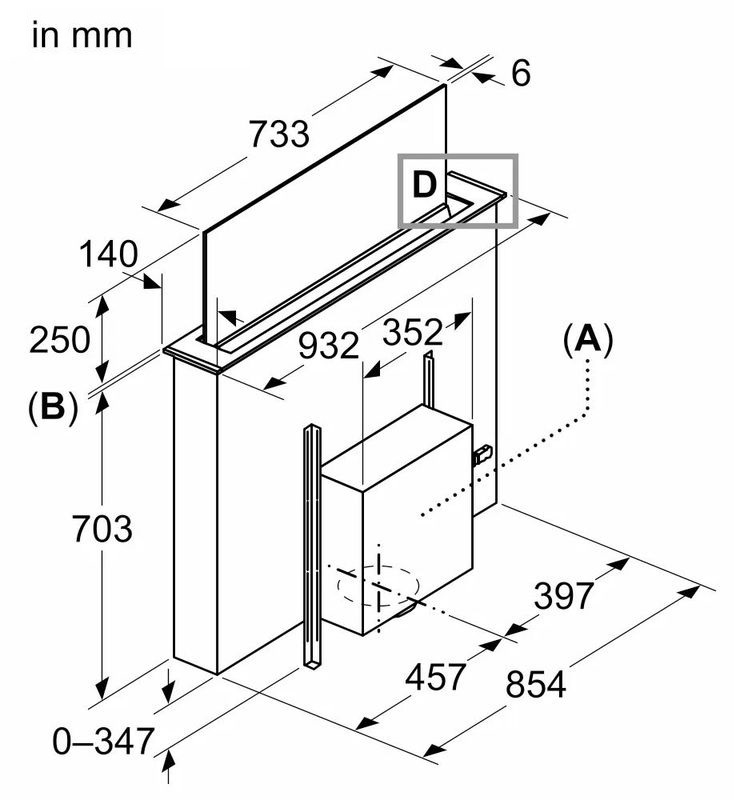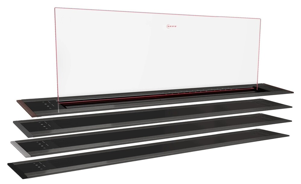 вытяжка встраиваемая в столешницу, 92 см, 833 м3/ч, черный. Выдвижная телескопическая вытяжка, встроенная в верхнюю часть, Flex Design 90 см, профили в комплект не входят, приобретается в качестве обязательных аксессуаров в 4 цветах по вашему выбору, дизайн стекла с рассеянным освещением (светодиодный световой луч, изменяемый через HomeConnect), GuideAir (технология улавливания паров даже в зоны, наиболее удаленные от источника вытяжки), HomeConnect, управление вытяжкой, голосовое управление, автоматический датчик воздуха, класс энергопотребления A, 62 дБ, 3 скорости + 2 интенсивных уровня