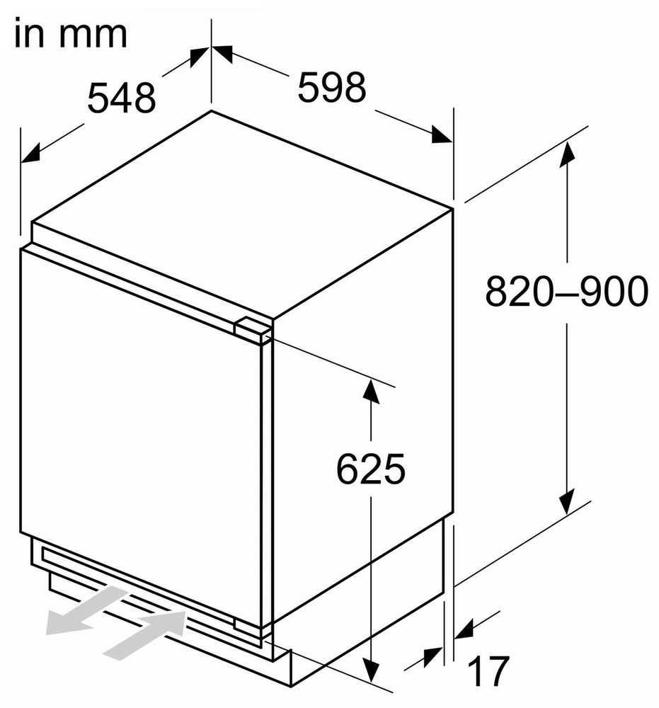 холодильник однокамерный встраиваемый, 110 л, класс энергопотребления D, 59,8х54,8х82 см. Холодильник однодверный, морозильное отделение, Home Connect, холодильник Eco AirFlow, электронное управление со светодиодным дисплеем, плоские петли, общий объем 110 л (93 л + 17 л)