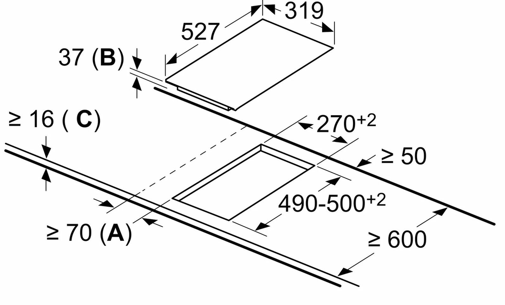 Характер огранки фаски на внешней стороне варочной панели. Металлические рамки предотвращают забивание монтажных швов крошками и пылью.