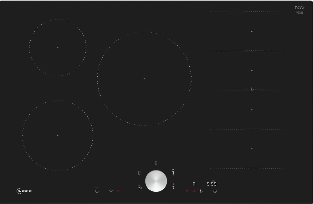 поверхность варочная стеклокерамическая индукционная, 80 см, 1 зона FlexInduction + 3 одиночные зоны, TwistPad, Скошенный передний профиль, Расширенный датчик жарения, 11 уровней, PowerManagement, Home Connect