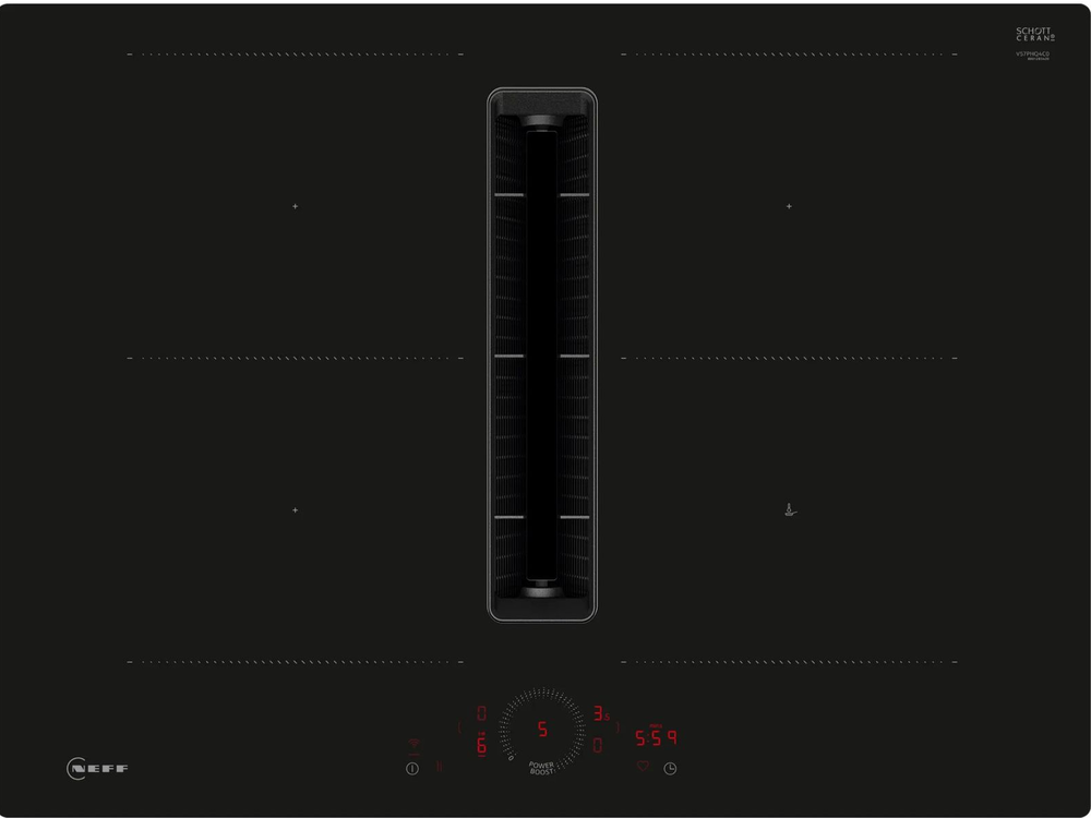 поверхность варочная стеклокерамическая индукционная с встроенной вытяжкой, 70 см, черный, (можно встроить в отверстие шириной 60 см), 2 зоны CombiInduction, управление Twist Touch, установка заподлицо, расширенный датчик жарения, 11 уровней, PowerManagement, встроенная вытяжка с 9 скоростями плюс 2 интенсивные, Home Соединять