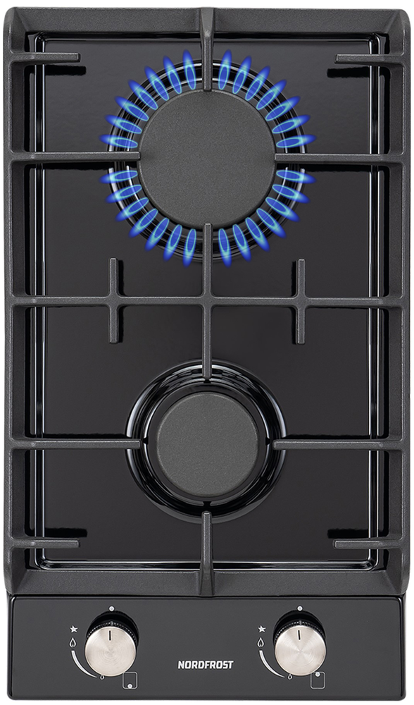 поверхность газовая независимая, 30 см, газ на эмали, 2 конфорки, решетки чугунные, черный