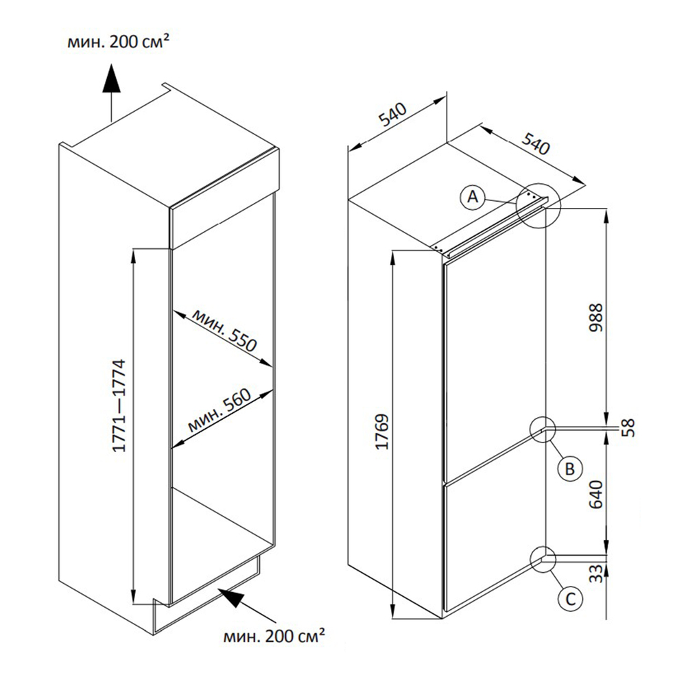 холодильник-морозильник встраиваемый, 238 л, класс энергопотребления А+, капельная система размораживания, 54х54х176,9 см
