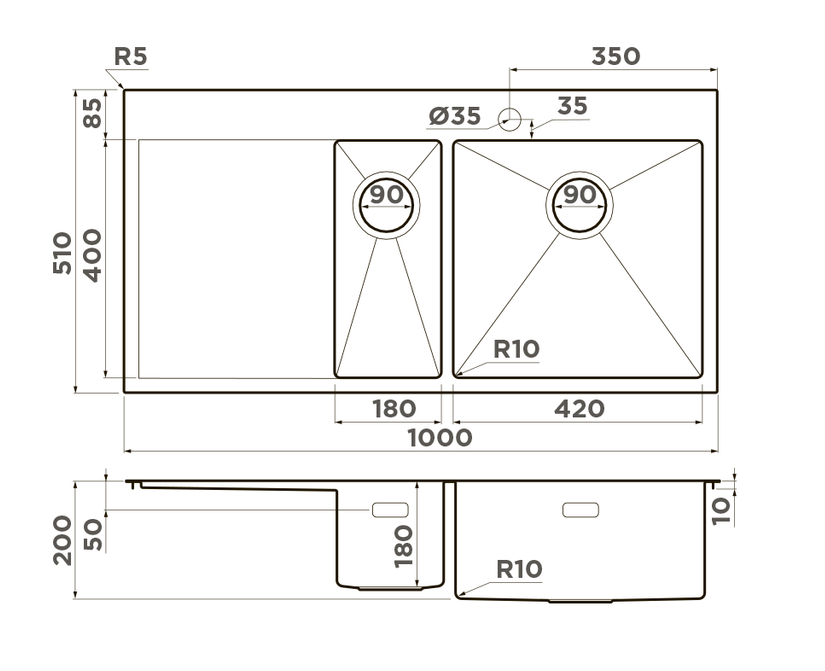 мойка, нержавеющая сталь, 1000x510 мм, вороненая сталь, чаша справа