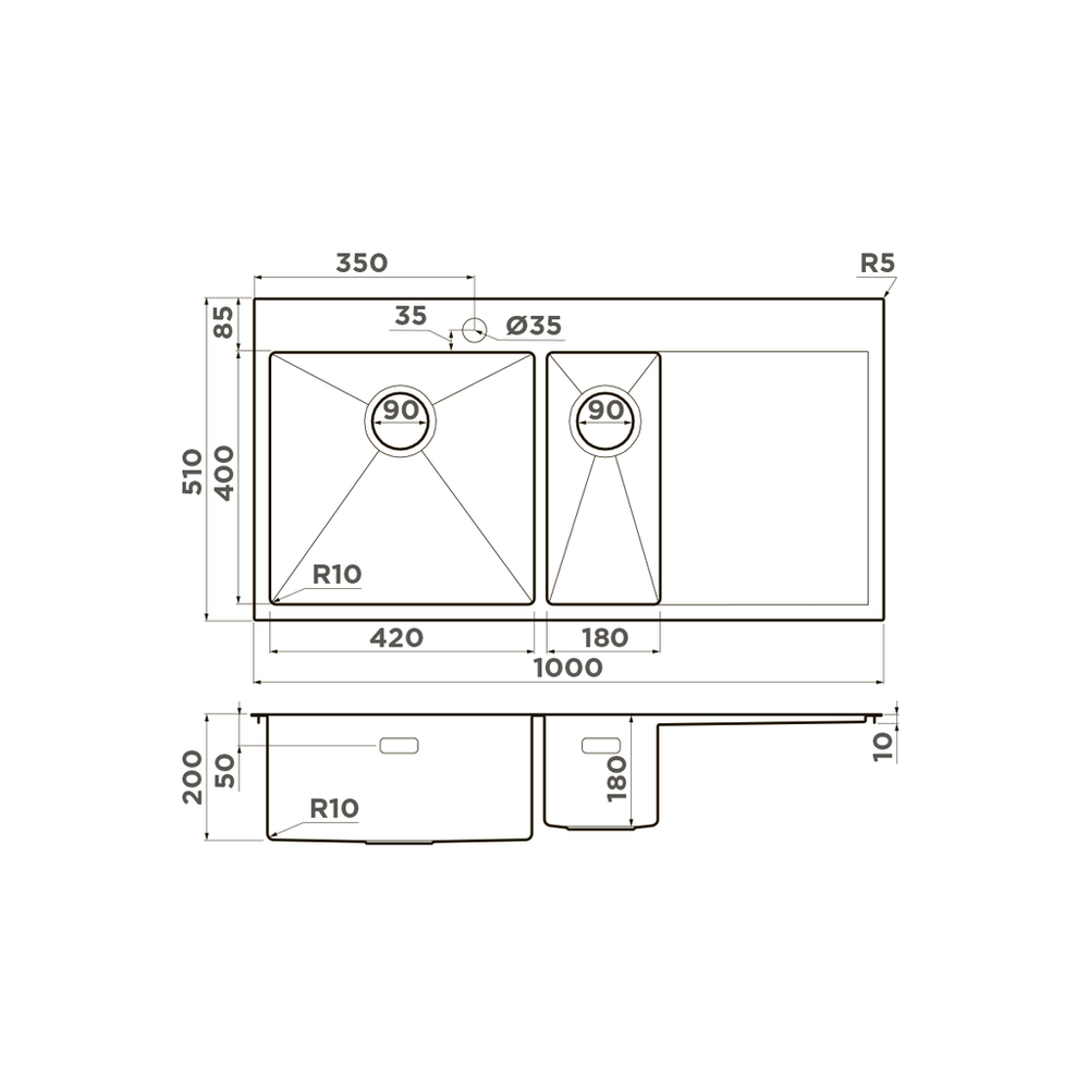 мойка, нержавеющая сталь, 1000x510 мм, нержавеющая сталь, чаша слева