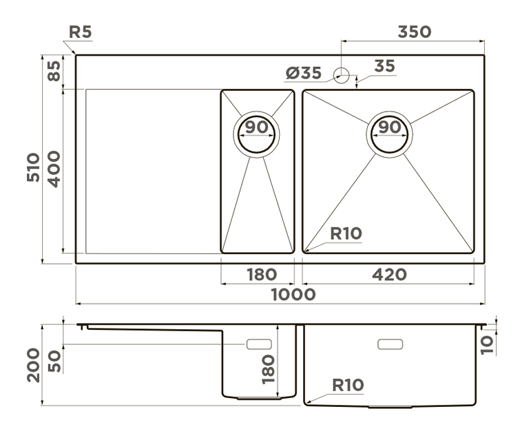 мойка, нержавеющая сталь, 1000x510 мм, нержавеющая сталь, чаша справа