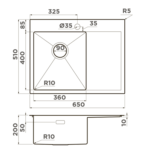 мойка, нержавеющая сталь, 650x510 мм, светлое золото, чаша слева