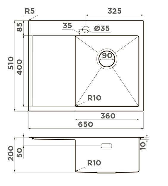 мойка, нержавеющая сталь, 650x510 мм, светлое золото, чаша справа
