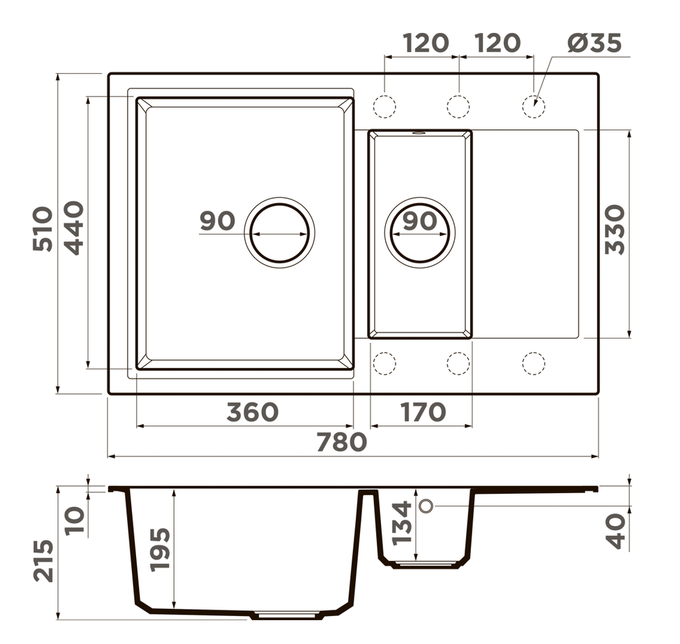 Расстояние от дна до верхней кромки чаши мойки. Оптимальная глубина — 15-18 см. Чем глубже мойка, тем меньше брызг попадет наружу.