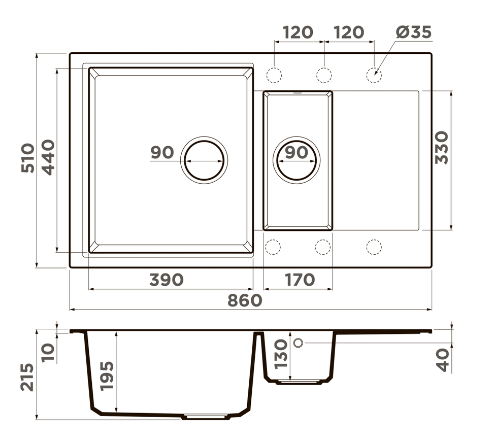 Расстояние от дна до верхней кромки чаши мойки. Оптимальная глубина — 15-18 см. Чем глубже мойка, тем меньше брызг попадет наружу.