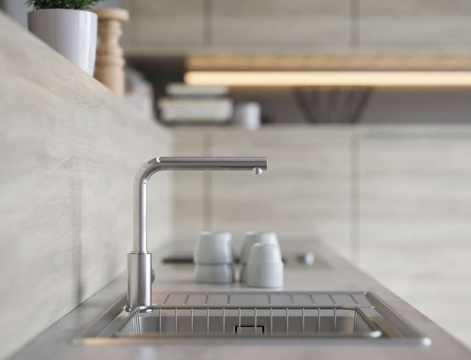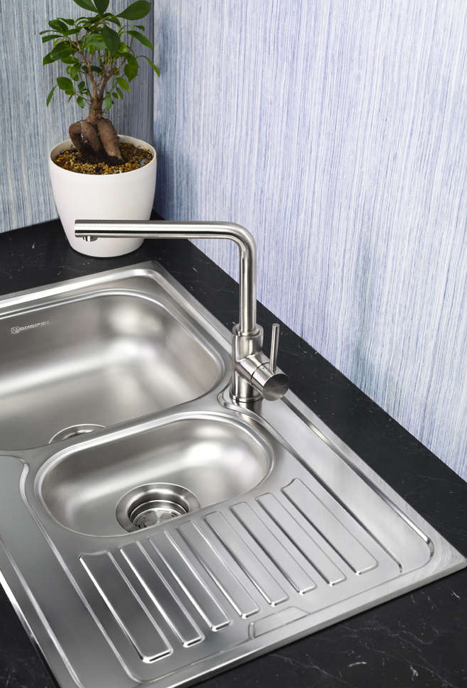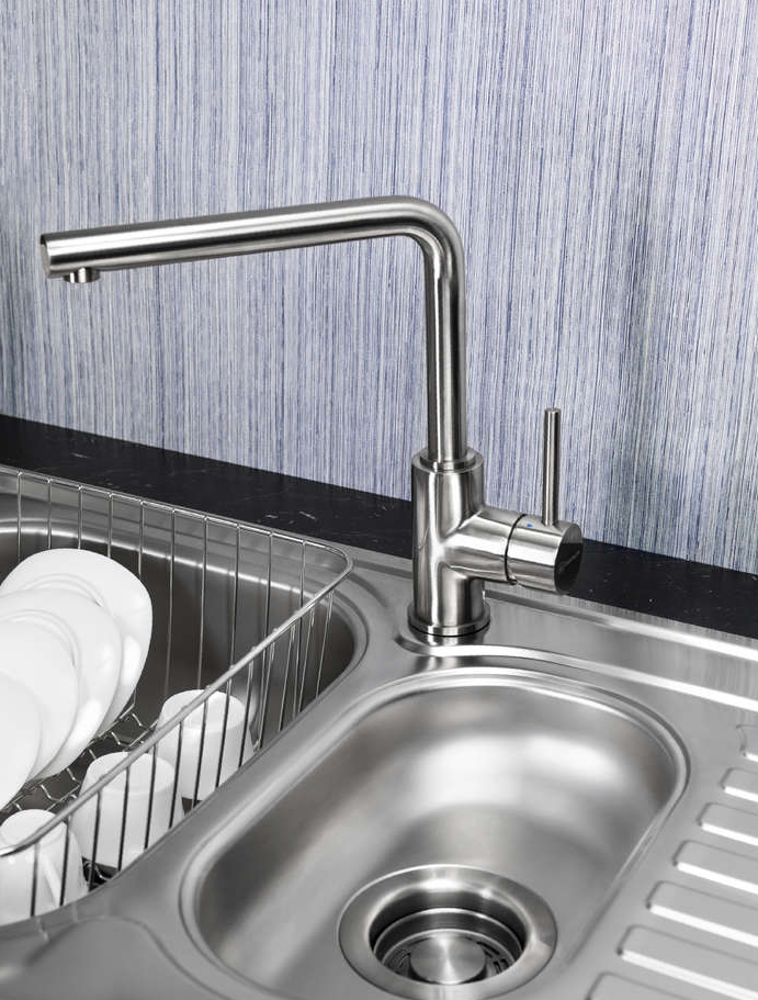 Встроенная в кран насадка на длинном гибком шланге с металлической оплеткой. Насадки с кнопкой могут переключать обычный излив воды на душ.