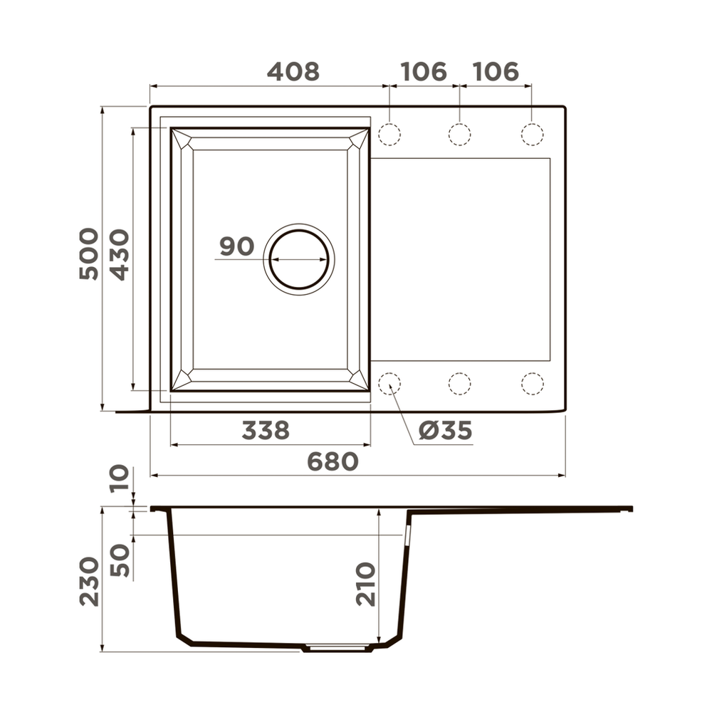 Расстояние от дна до верхней кромки чаши мойки. Оптимальная глубина — 15-18 см. Чем глубже мойка, тем меньше брызг попадет наружу.