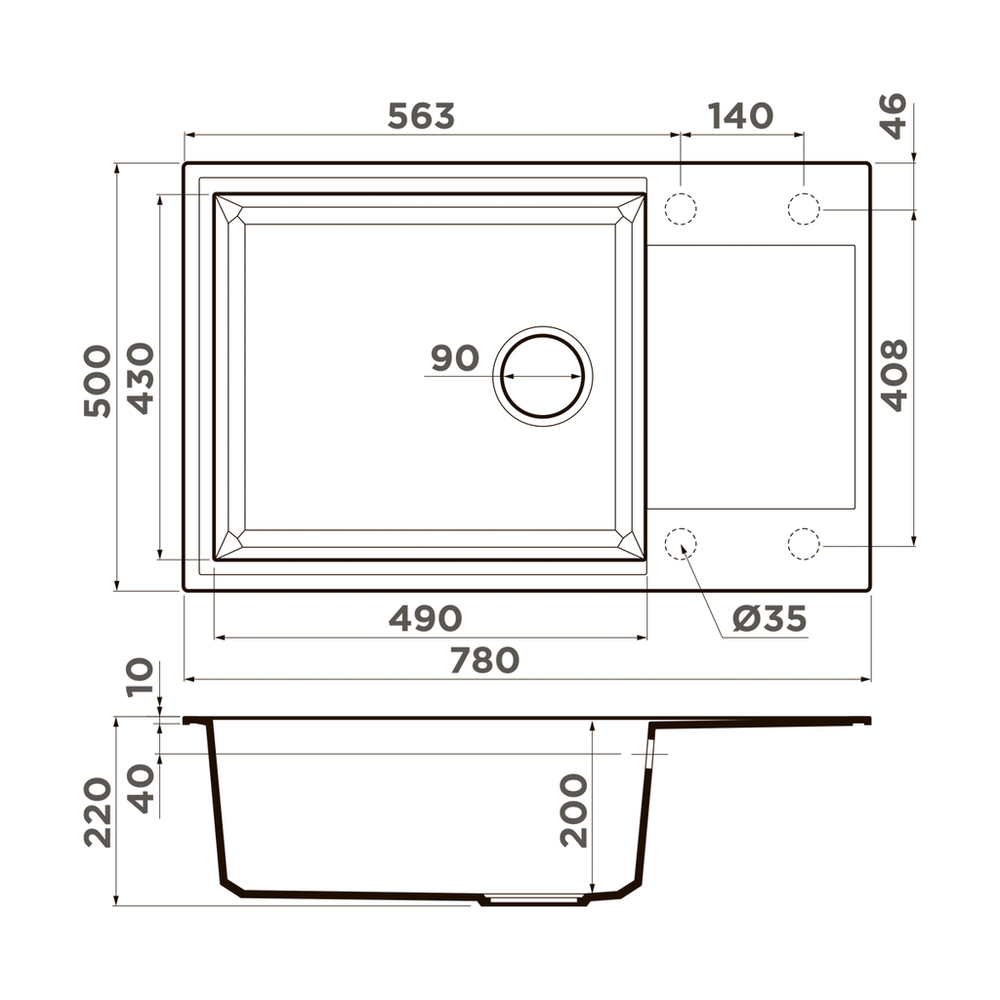 Расстояние от дна до верхней кромки чаши мойки. Оптимальная глубина — 15-18 см. Чем глубже мойка, тем меньше брызг попадет наружу.