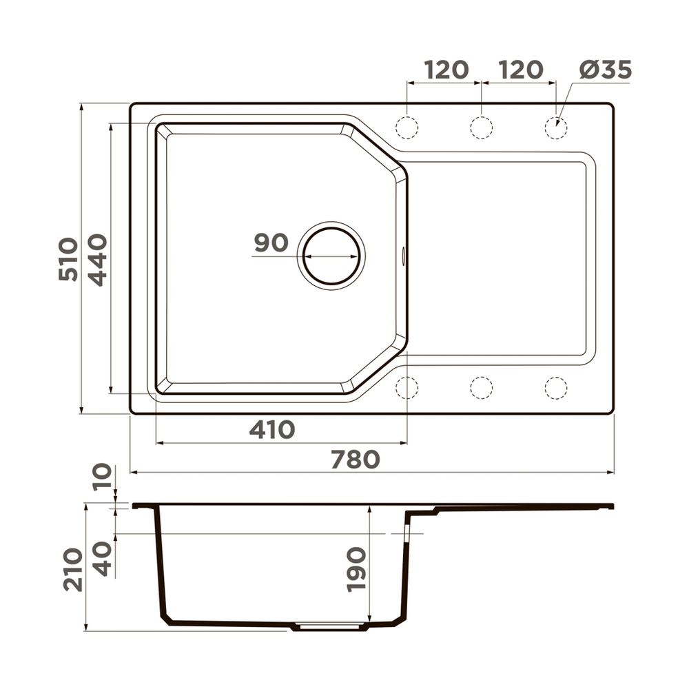 Расстояние от дна до верхней кромки чаши мойки. Оптимальная глубина — 15-18 см. Чем глубже мойка, тем меньше брызг попадет наружу.