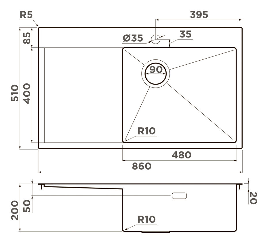 мойка, нержавеющая сталь, 860x510 мм, нержавеющая сталь, светлое золото, чаша справа