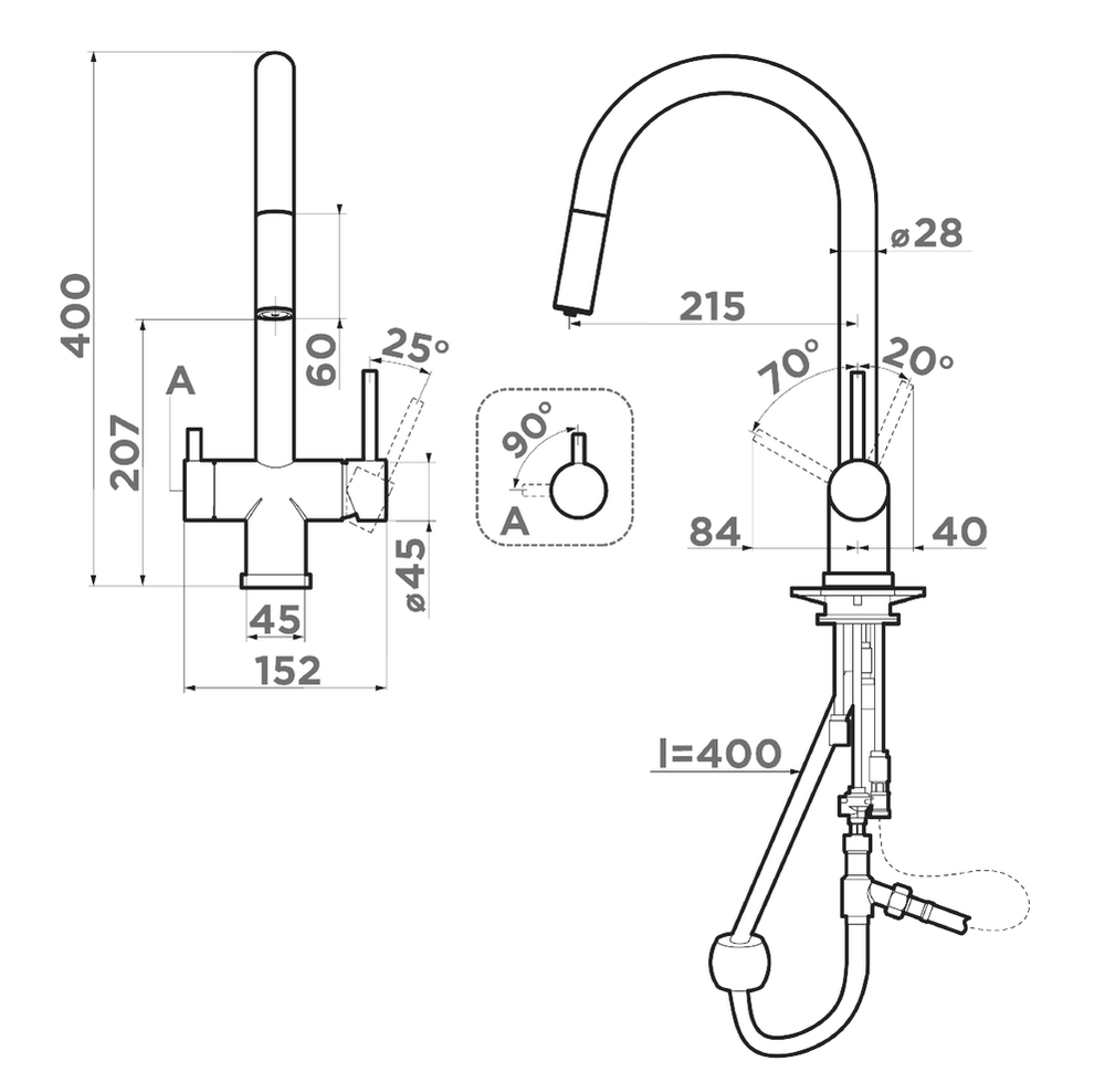 Встроенная в кран насадка на длинном гибком шланге с металлической оплеткой. Насадки с кнопкой могут переключать обычный излив воды на душ.