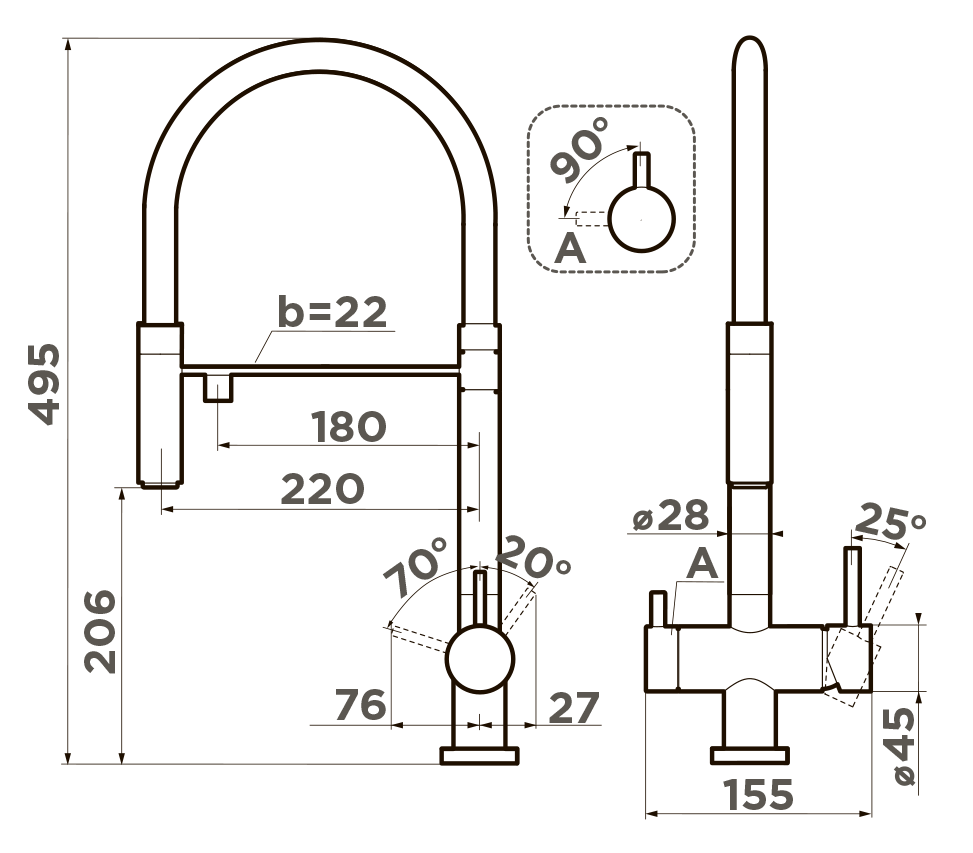 смеситель для кухни, латунь, дополнительный излив для фильтрованной воды, вороненая сталь/черный гибкий шланг