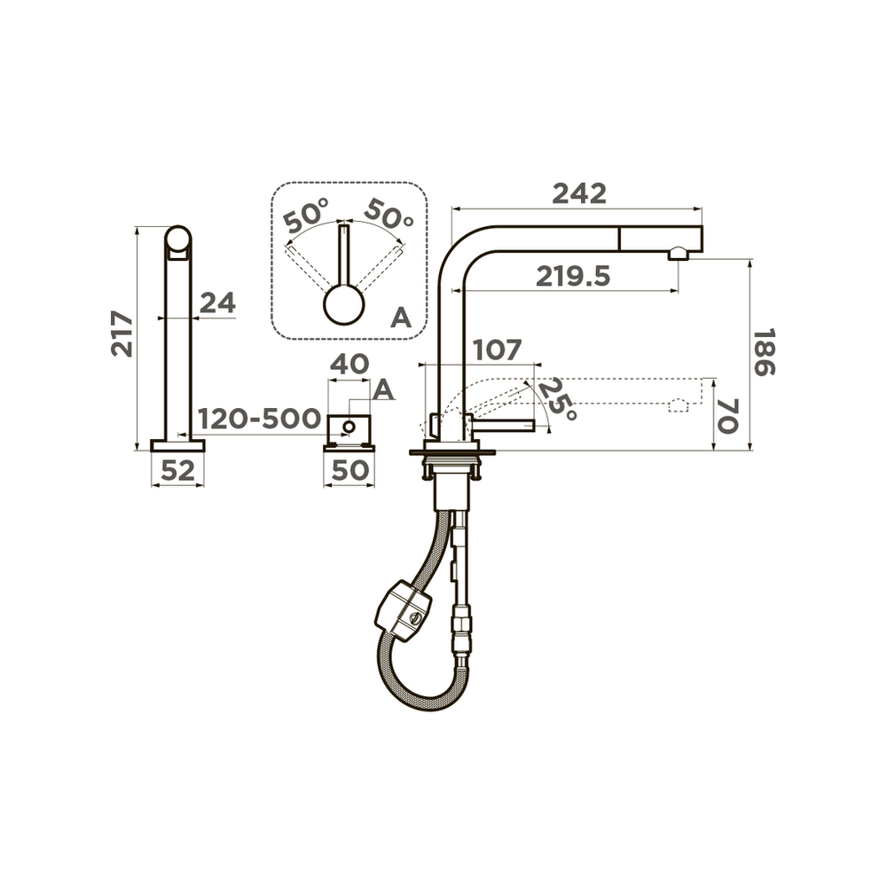 смеситель для кухни, латунь, высокий поворотный выдвижной излив, светлое золото