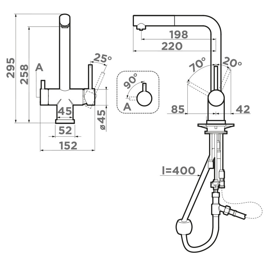Встроенная в кран насадка на длинном гибком шланге с металлической оплеткой. Насадки с кнопкой могут переключать обычный излив воды на душ.