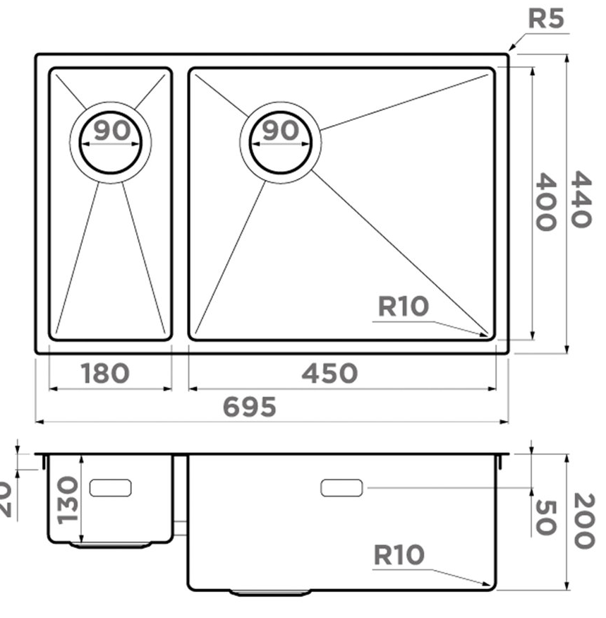 Расстояние от дна до верхней кромки чаши мойки. Оптимальная глубина — 15-18 см. Чем глубже мойка, тем меньше брызг попадет наружу.