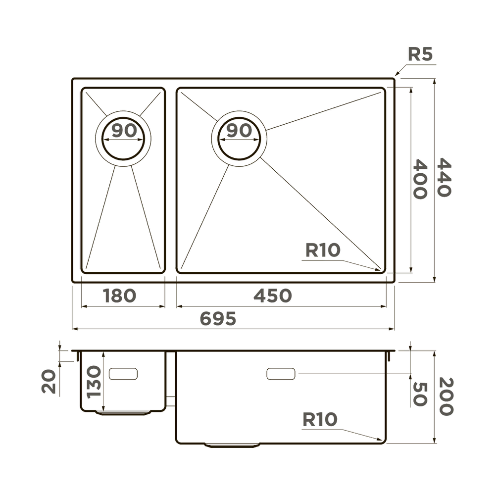Расстояние от дна до верхней кромки чаши мойки. Оптимальная глубина — 15-18 см. Чем глубже мойка, тем меньше брызг попадет наружу.