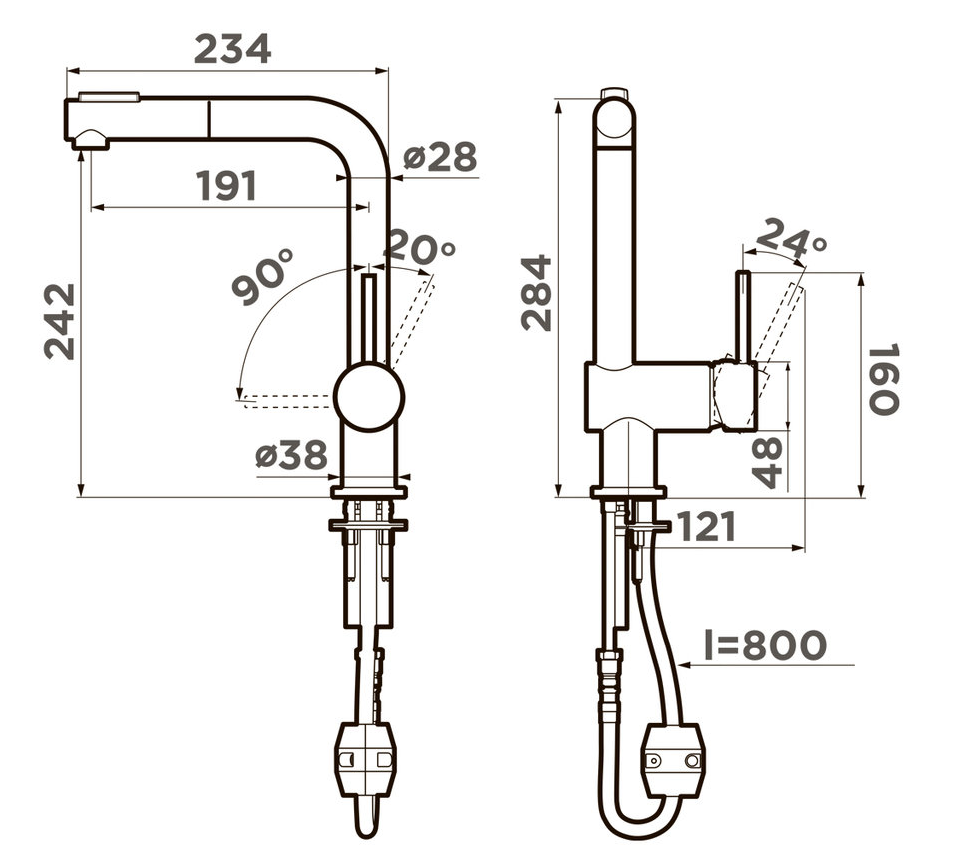 смеситель для кухни, латунь, высокий выдвижной излив, нержавеющая сталь