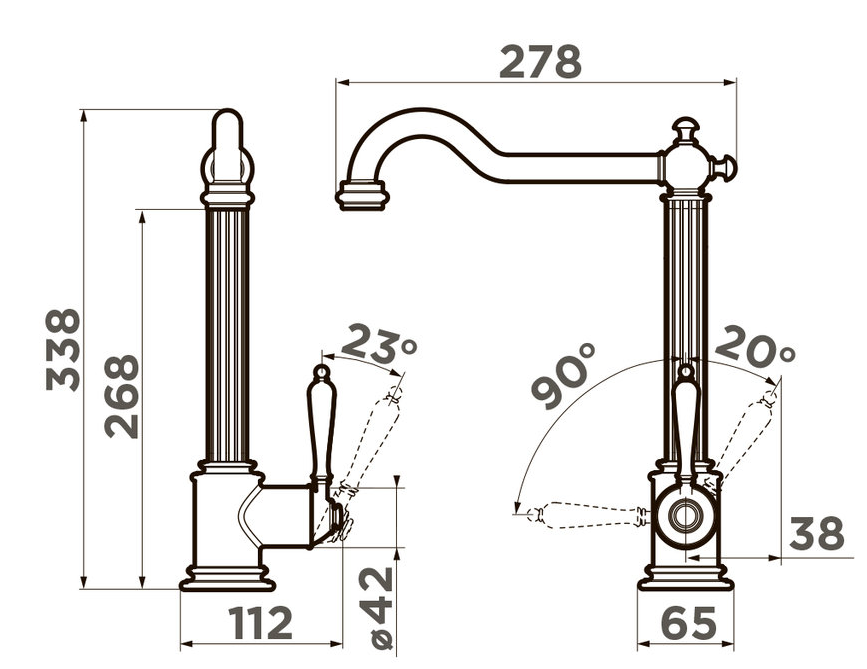 смеситель для кухни, латунь, высокий поворотный излив, античная латунь