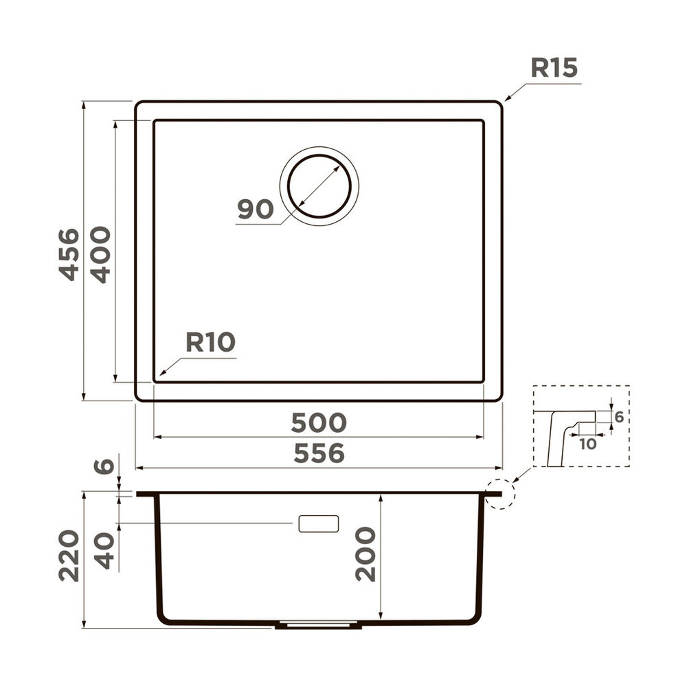 Расстояние от дна до верхней кромки чаши мойки. Оптимальная глубина — 15-18 см. Чем глубже мойка, тем меньше брызг попадет наружу.