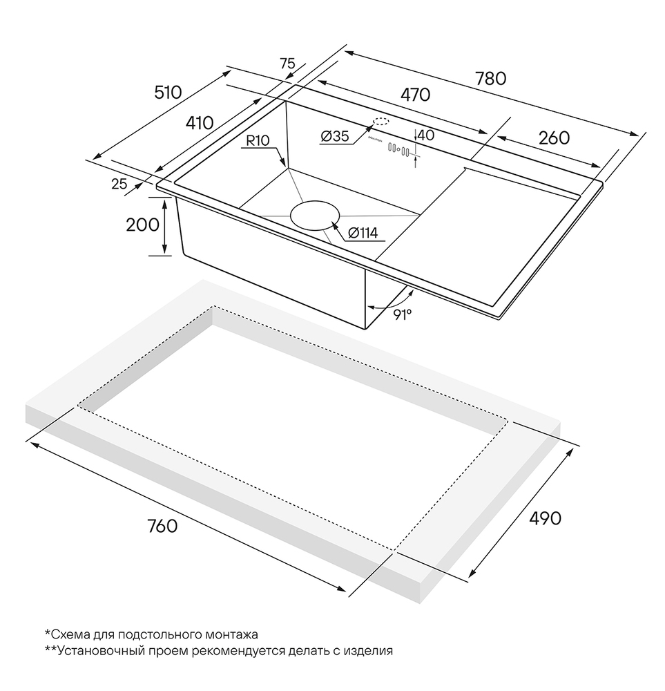 мойка, нержавеющая сталь, 780х510 мм, нержавеющая сталь брашированная