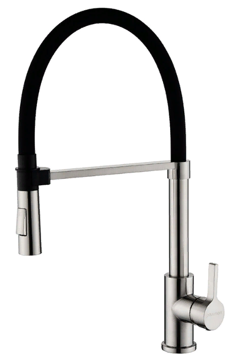 Встроенная в кран насадка на длинном гибком шланге с металлической оплеткой. Насадки с кнопкой могут переключать обычный излив воды на душ.