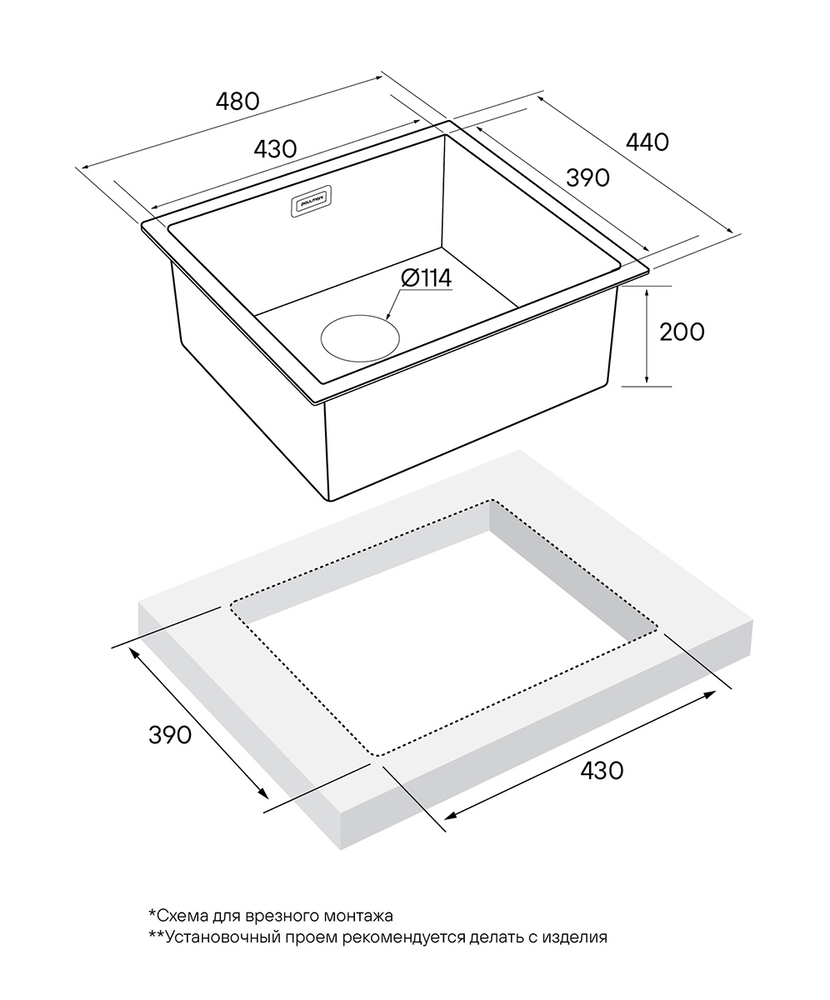 мойка, нержавеющая сталь, 480х440 мм, нержавеющая сталь брашированная