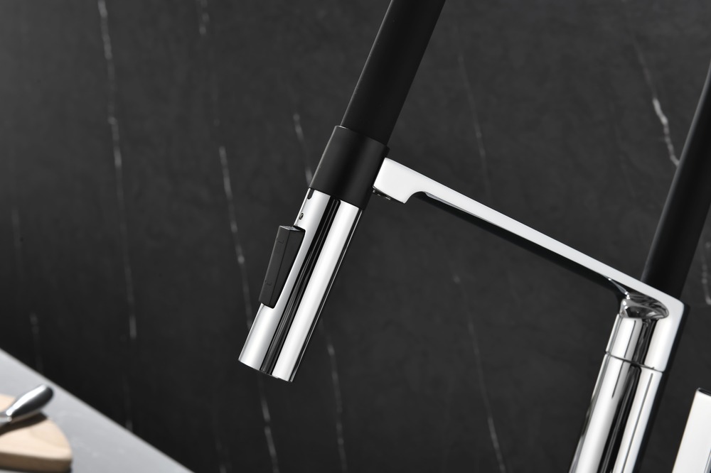 Встроенная в кран насадка на длинном гибком шланге с металлической оплеткой. Насадки с кнопкой могут переключать обычный излив воды на душ.