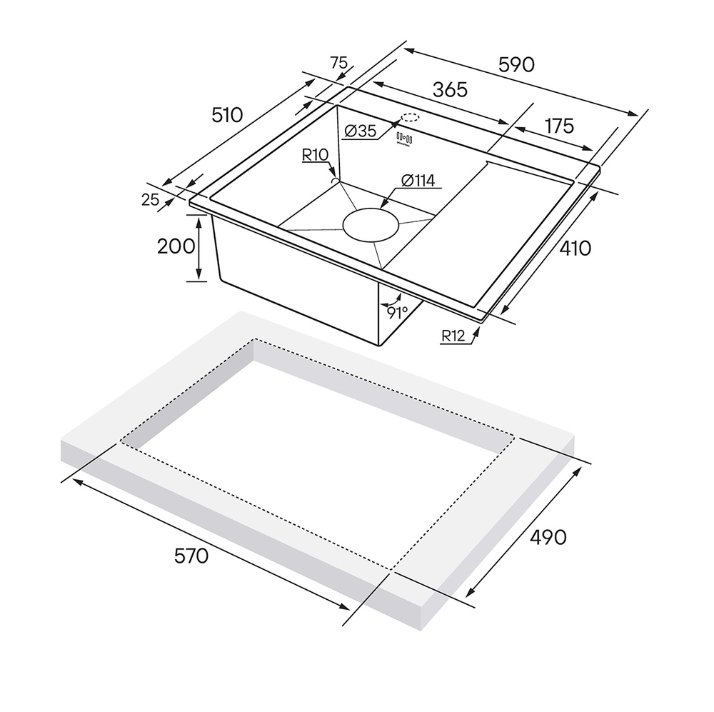Расстояние от дна до верхней кромки чаши мойки. Оптимальная глубина — 15-18 см. Чем глубже мойка, тем меньше брызг попадет наружу.