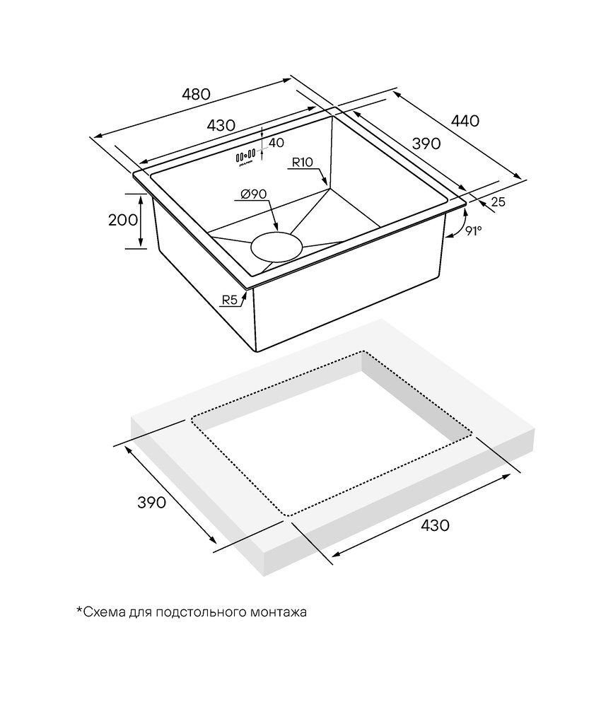 мойка, нержавеющая сталь, 480х440 мм, вороненая сталь