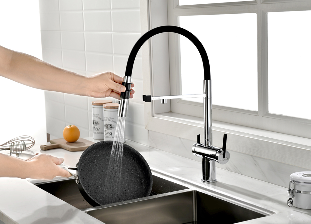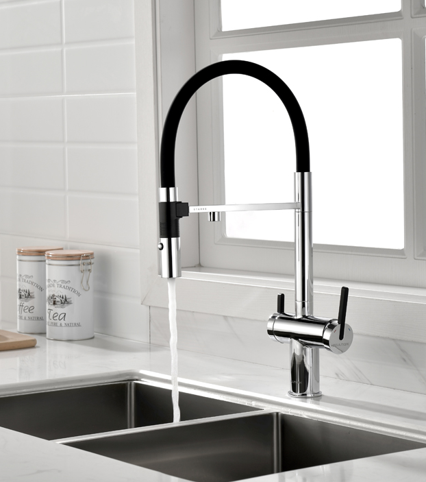 смеситель для кухни, латунь, дополнительный излив для фильтрованной воды, хром, черный шланг