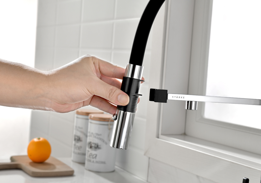 Встроенная в кран насадка на длинном гибком шланге с металлической оплеткой. Насадки с кнопкой могут переключать обычный излив воды на душ.
